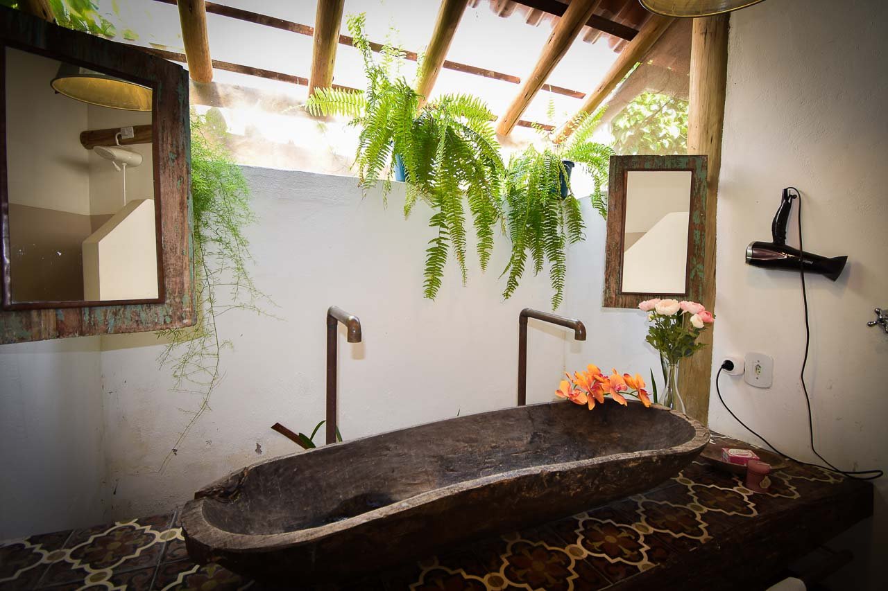 A Suíte Rústica da Trancoso House Casa de Temporada faz jus ao seu nome, oferecendo um ambiente acolhedor com detalhes cheios de charme. A cama com dossel e cortinado e a pia esculpida em uma única peça de madeira trazem personalidade e autenticidade ao espaço.
