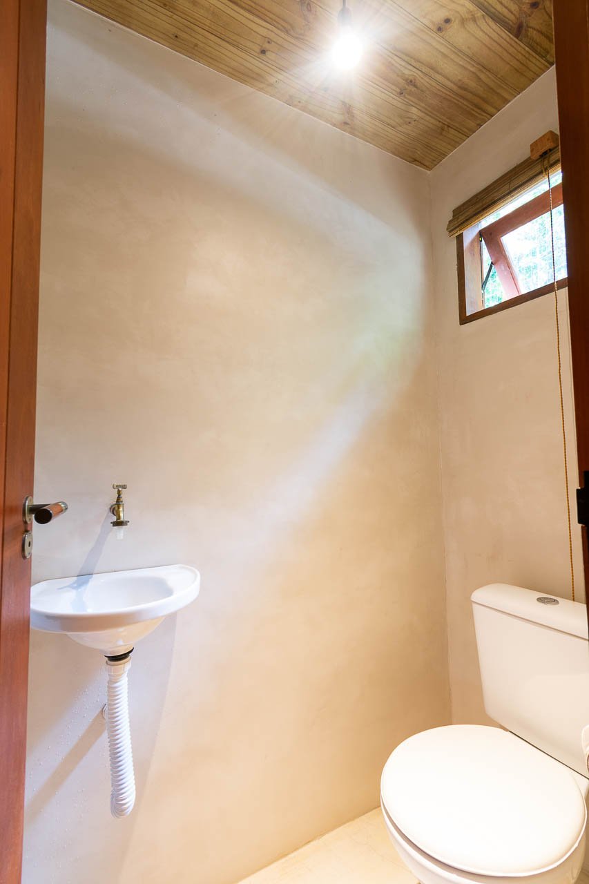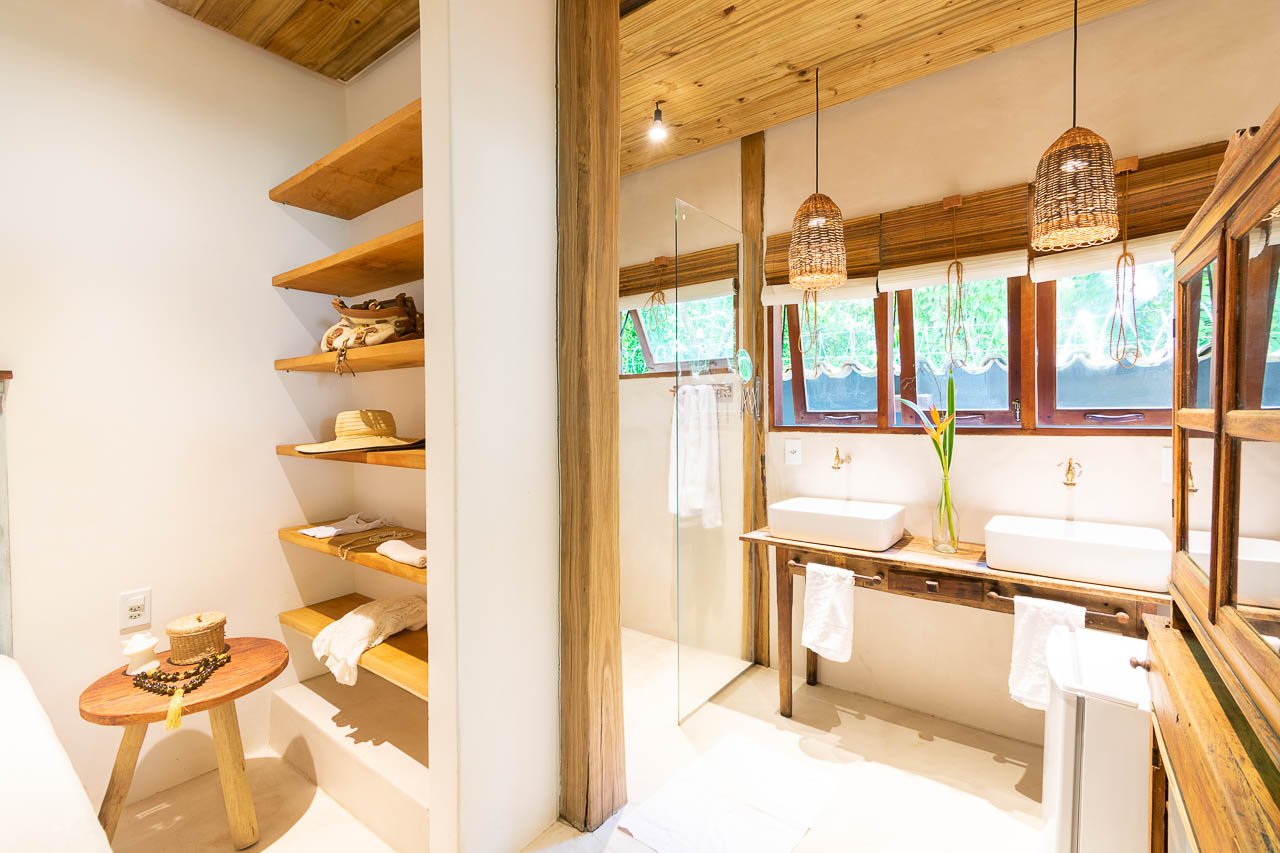 A Suíte Chalet é o destaque da Trancoso House, sendo a única acomodação independente da casa. Um refúgio exclusivo que combina design moderno e funcional com toques rústicos, onde o chuveiro e as pias foram integrados de forma harmoniosa ao ambiente do quarto.