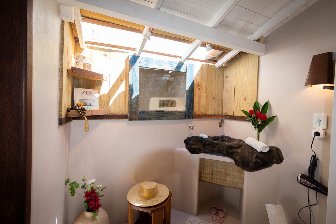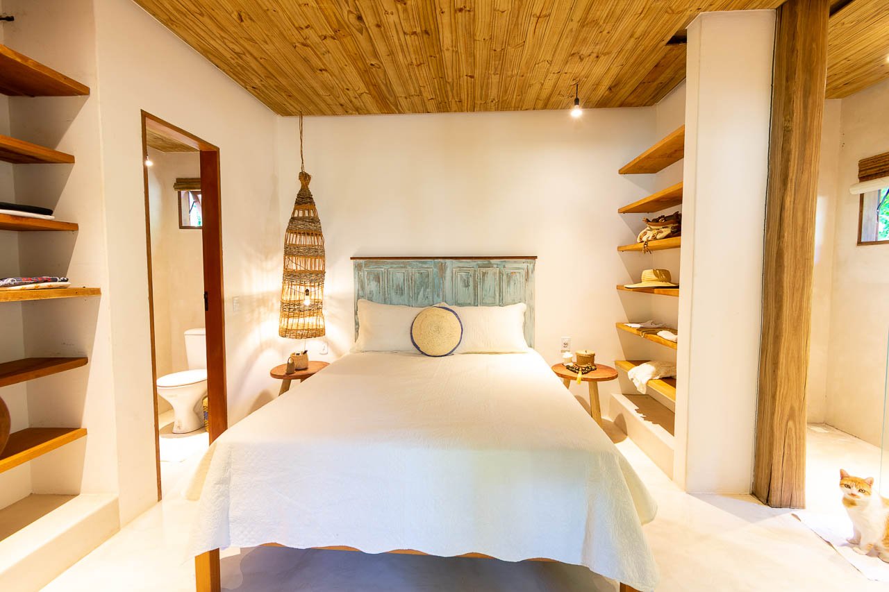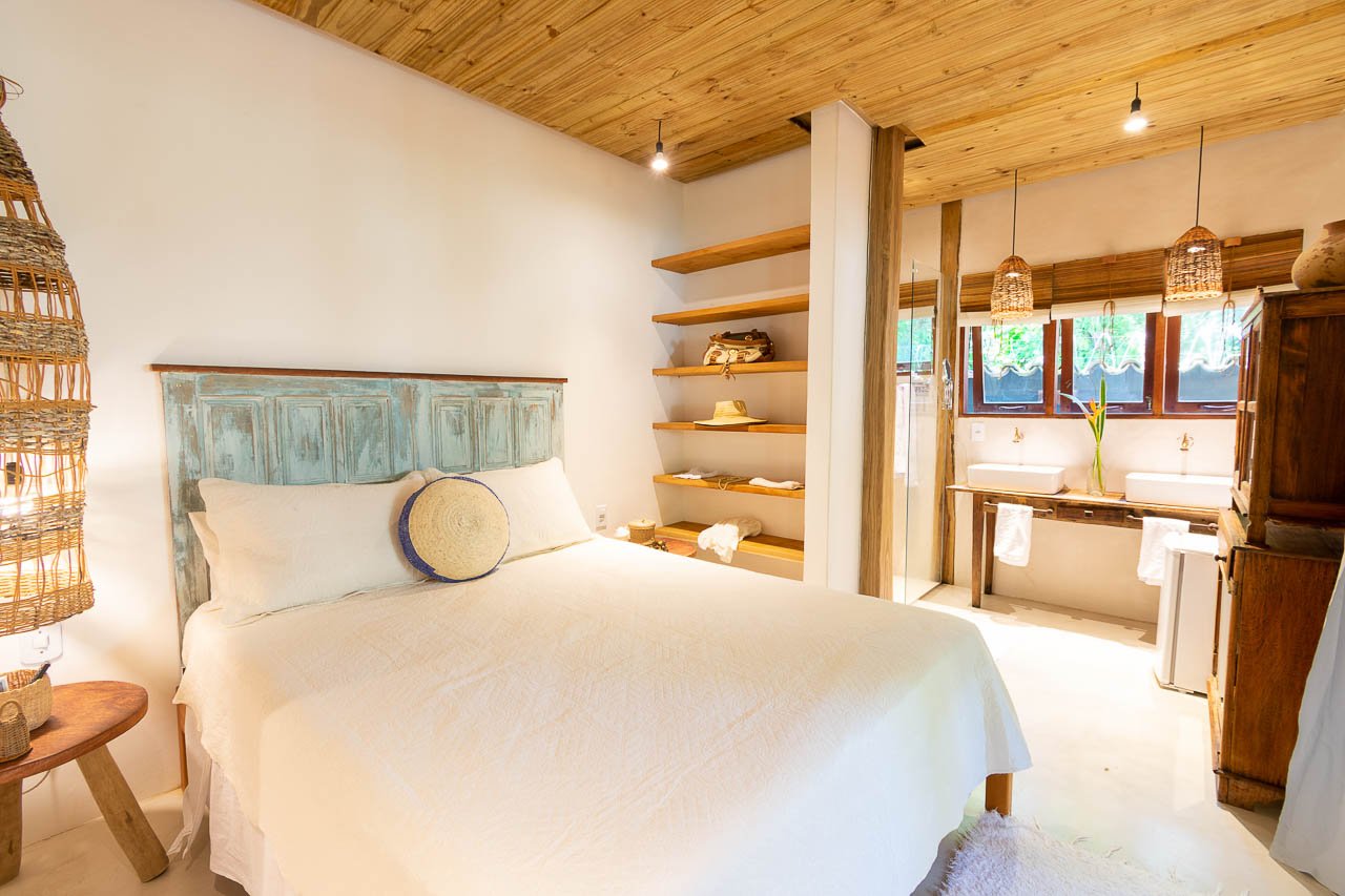 Equipada com colchão queen-size, ar-condicionado, Smart TV, frigobar, Wi-Fi, mesa de trabalho, espelho de corpo inteiro e secador de cabelo semiprofissional, a suíte garante conforto e praticidade em todos os detalhes. O banheiro privativo completa a experiência, oferecendo a privacidade necessária para uma estadia relaxante em Trancoso.
